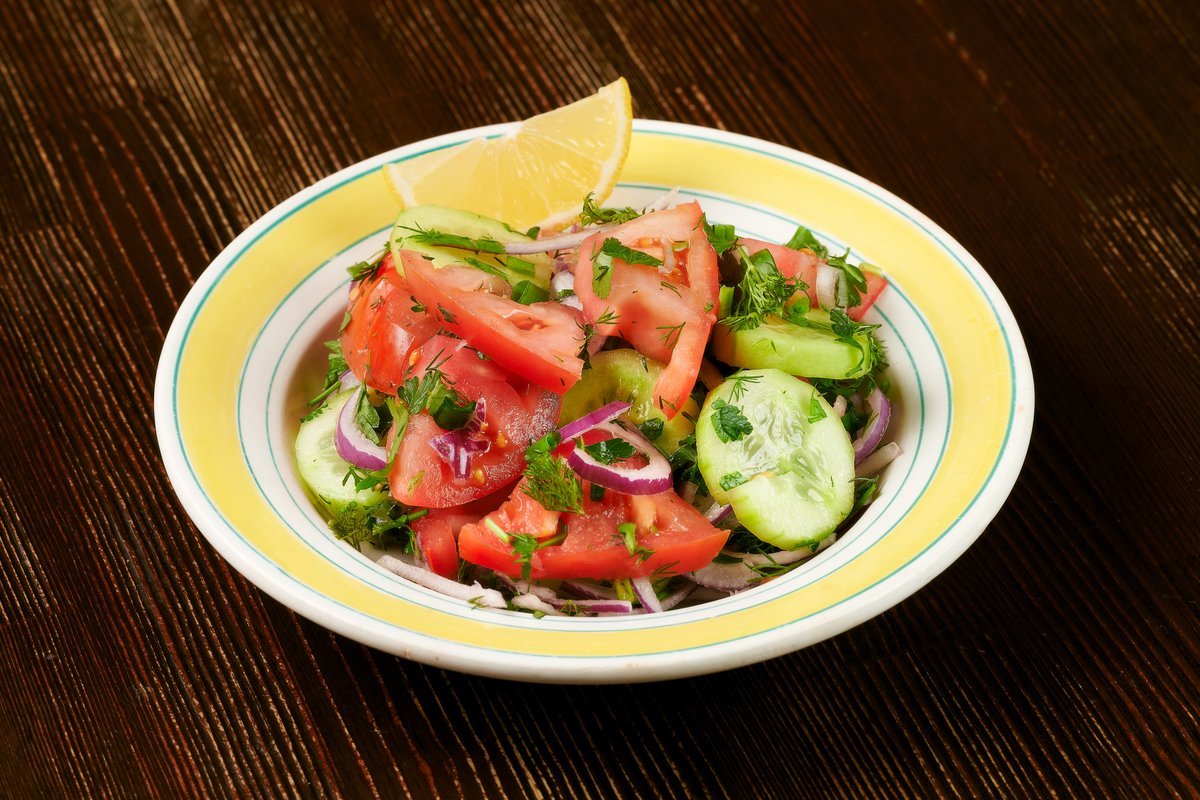 Pomidorai, agurkai, svogūnai, šviežios žolelės, alyvuogių aliejus