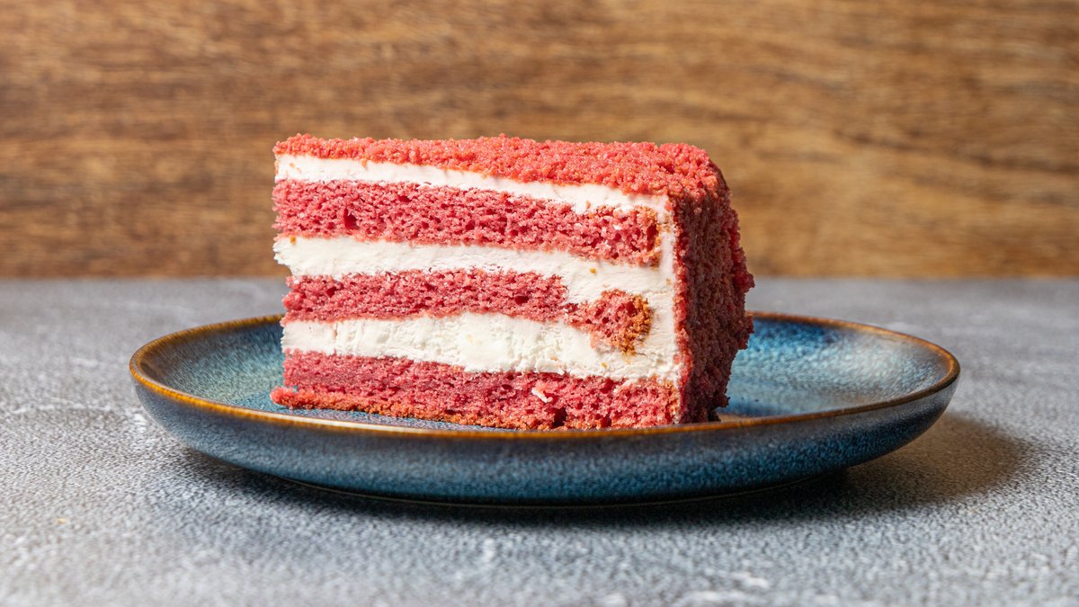 Indulge in a 120gr soft, moist red velvet slice, with vibrant red color, and a luscious cream cheese frosting.