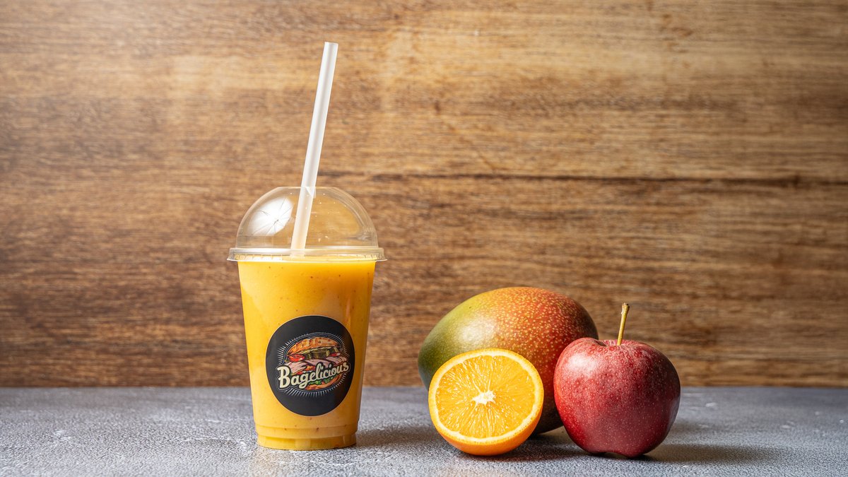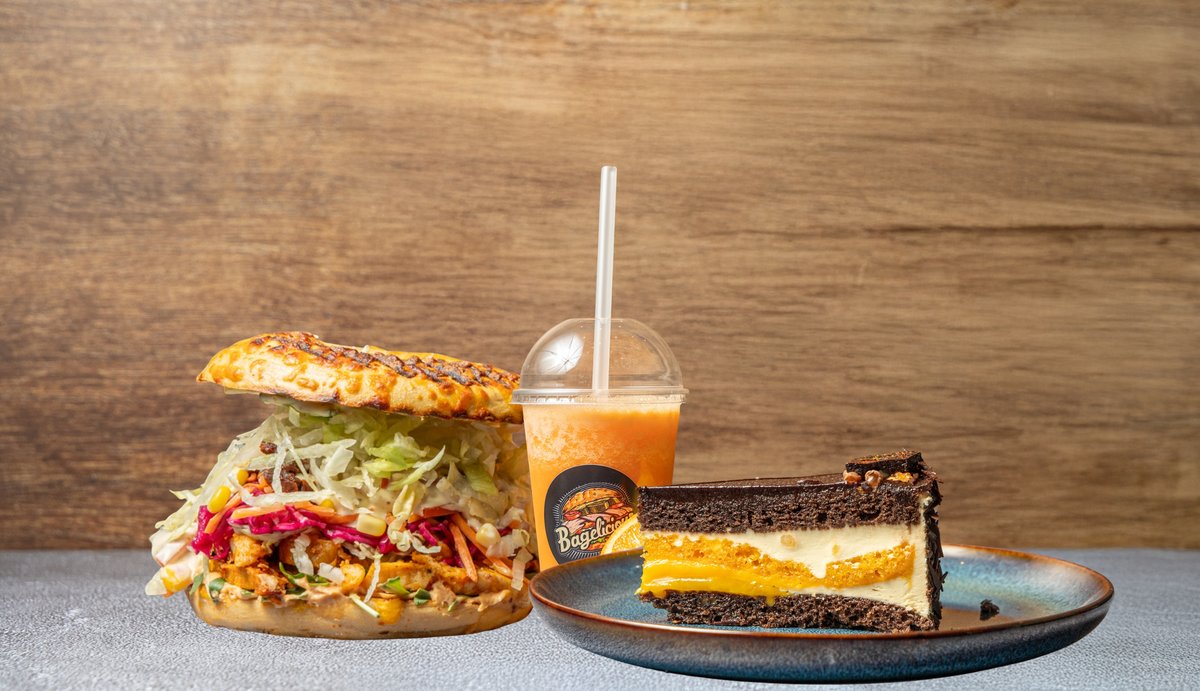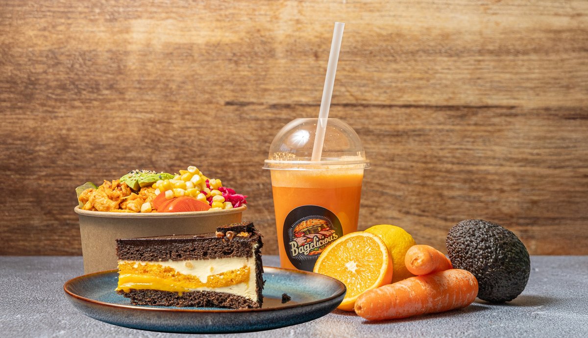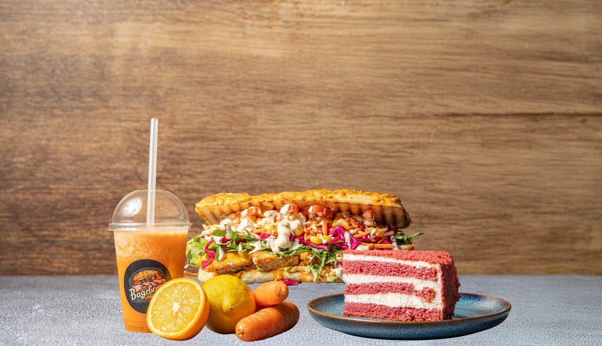Bagel + 100% natural Carrots, Orange & Lemon drink size M (400ml) + Delightful Cake