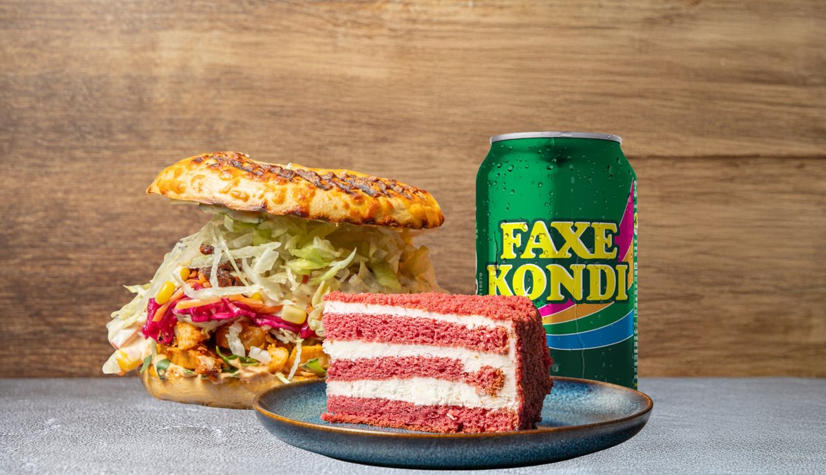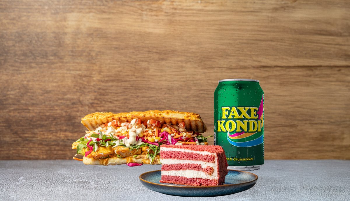 Enjoy a satisfying combo of a fresh baguette, a fizzy sodavand, and a delectable cake slice.