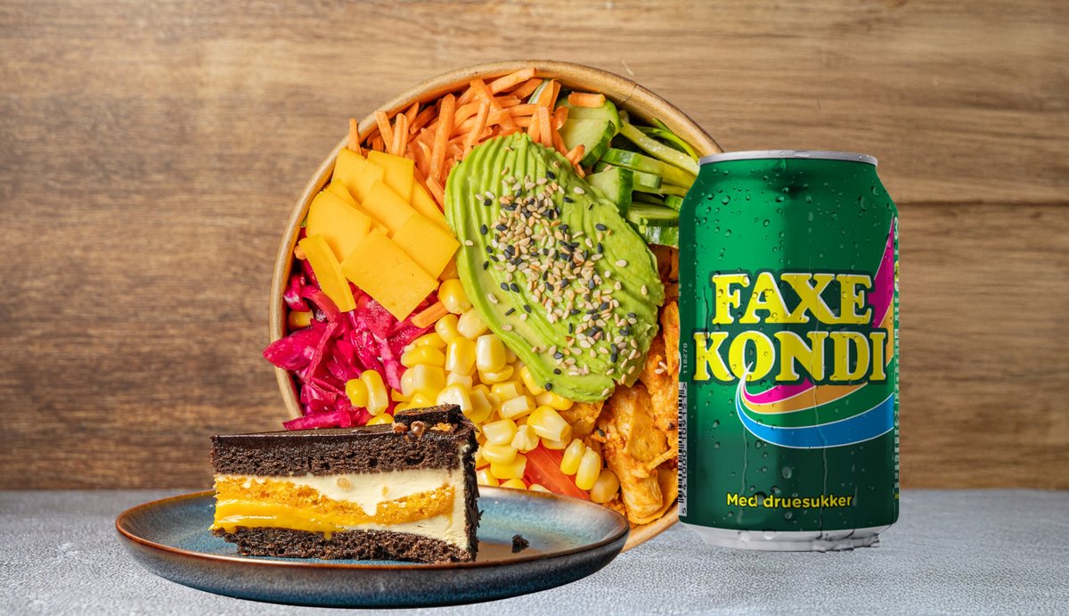Enjoy a combo of a hearty bowl meal, refreshing soda, and a slice of delicious cake.