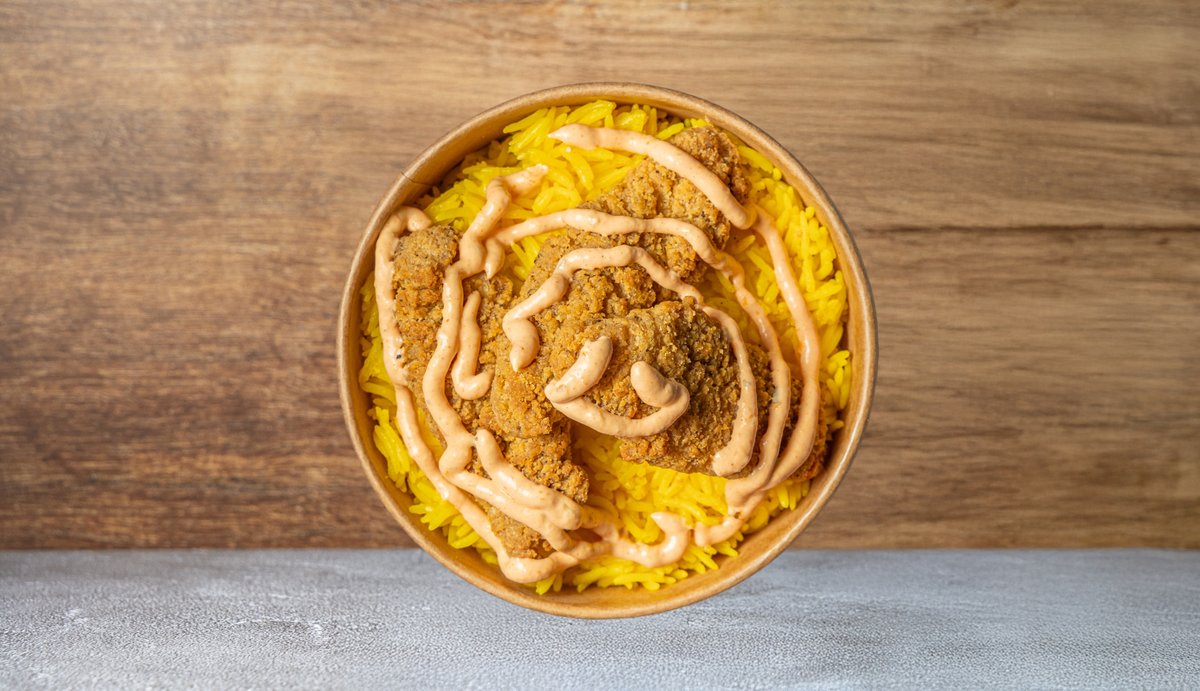 Oven cooked crispy chicken strips served with rice or pasta, fresh toppings & savory dressing