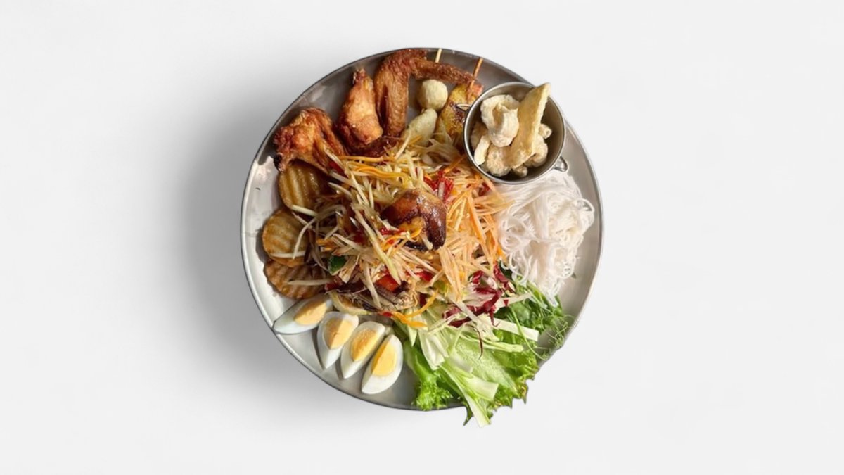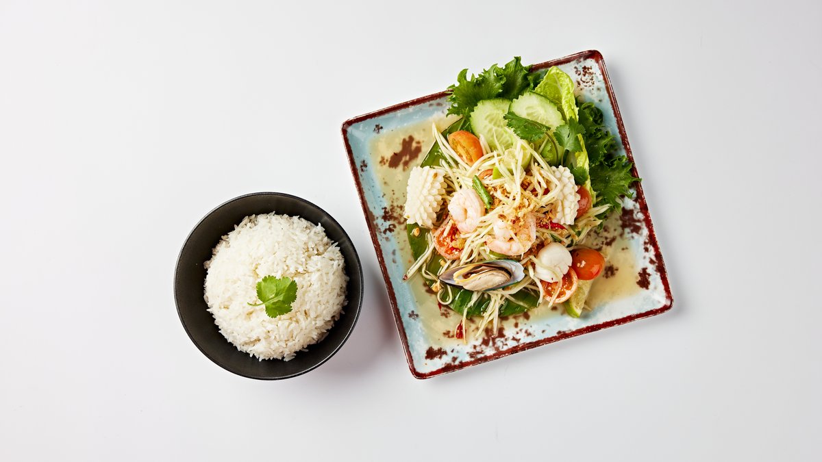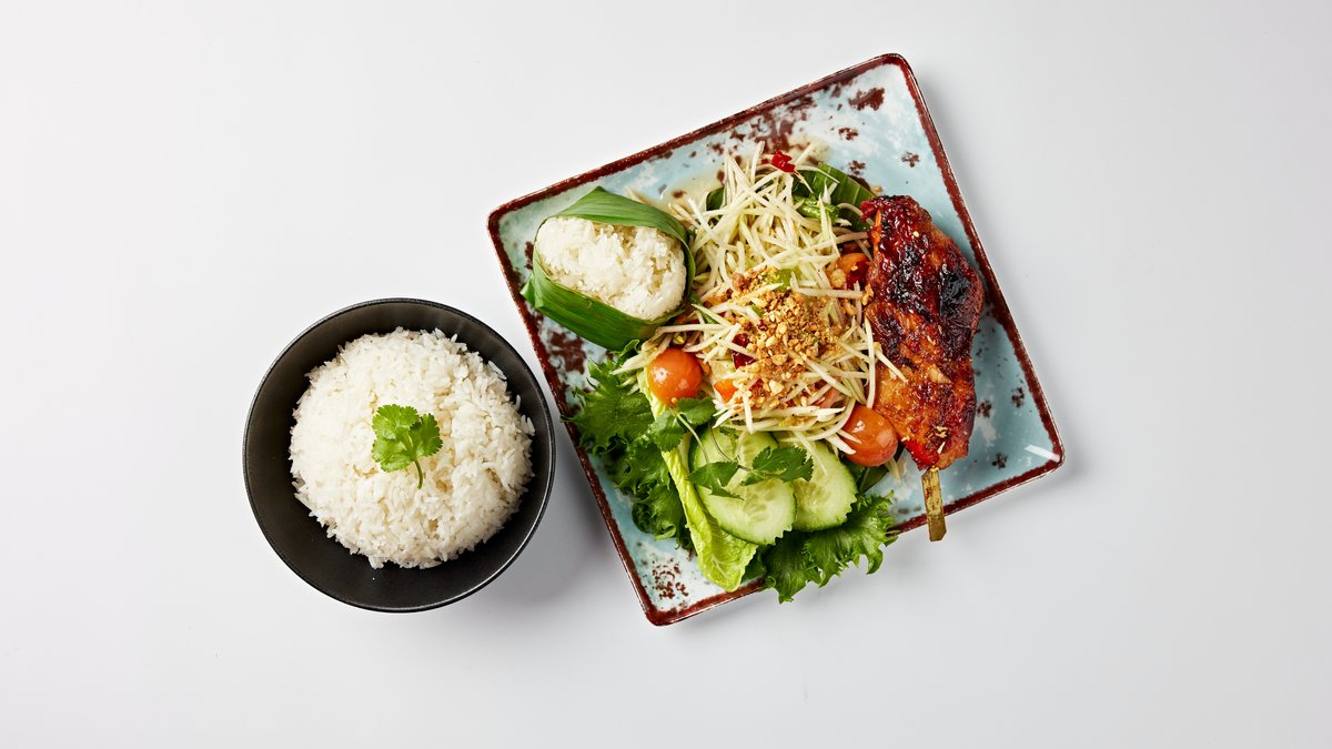 Vihreä papaijasalaatti on mausteinen salaatti, joka on valmistettu murskatuista kypsymättömistä papaijoista. Som Tam on alunperin Lao-kansalta, ja sitä syödään kaikkialla Kaakkois-Aasiassa. Lihan alkuperämaa: Kana - Thaimaa Sika - Saksa S=Äyriäiset V= Sopii kasvissyöjille W= Sisältää vehnää L= Laktoositon G= Gluteeniton