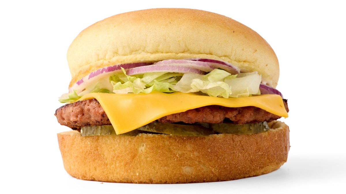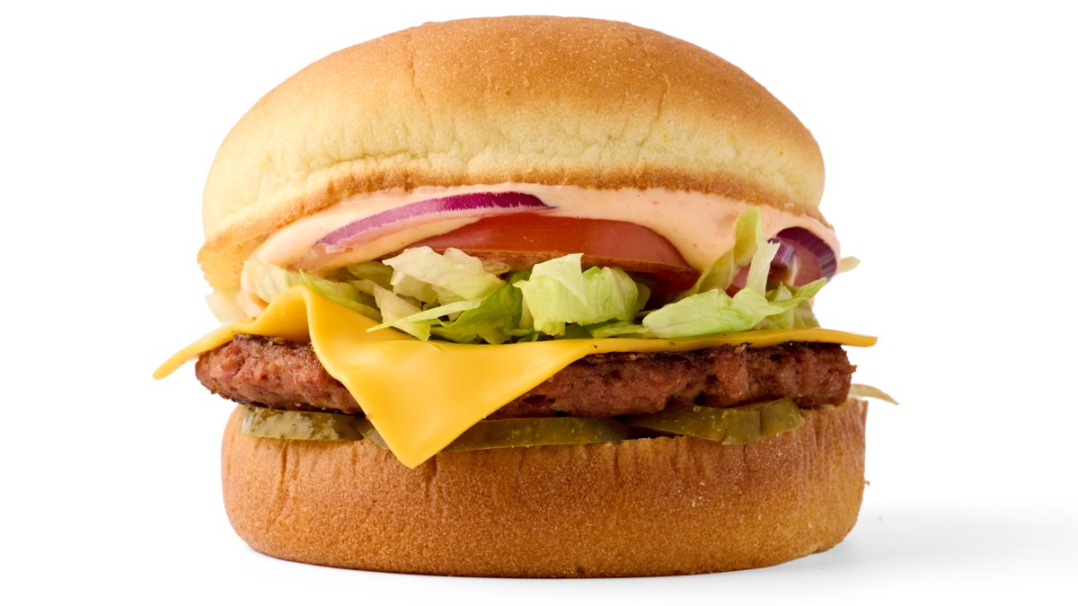 Valkosipulimajoneesia, Plant-Based -pihvi, sulatettua cheddar-juustoa, suolakurkkuja, punasipulia ja raikasta jäävuorisalaattia, pehmeässä potato bun -sämpylässä.