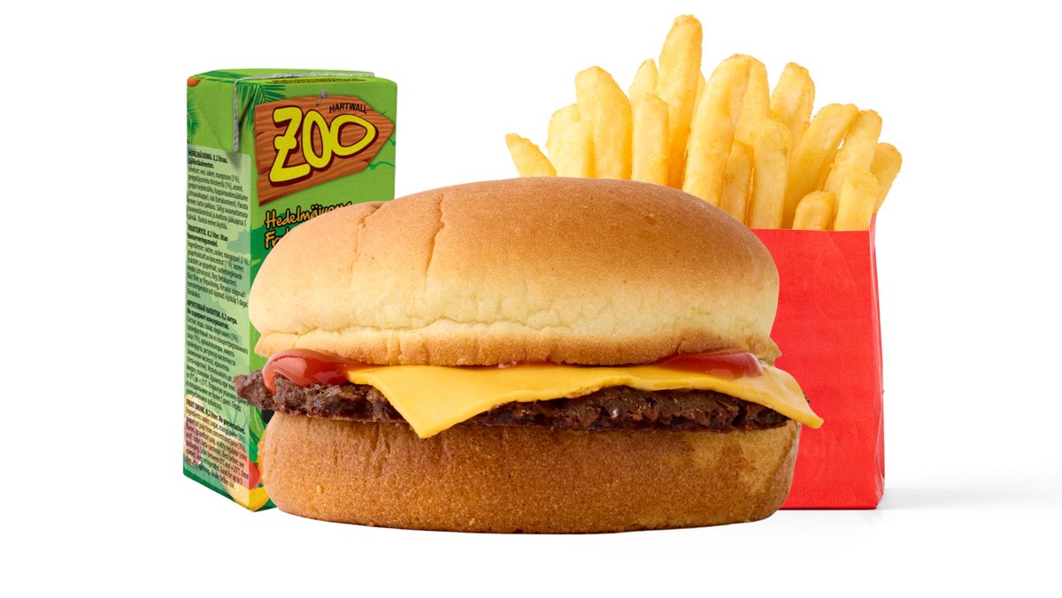 Sisältää KIDS CHEESE BURGER, pienet ranskalaiset ja pillimehun.