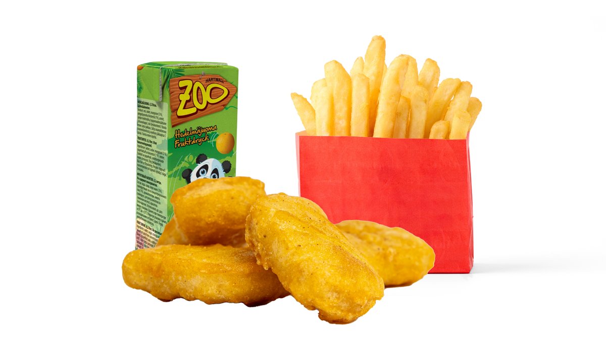Sisältää neljä kappaletta kananugetteja, pienet ranskalaiset ja pillimehun.