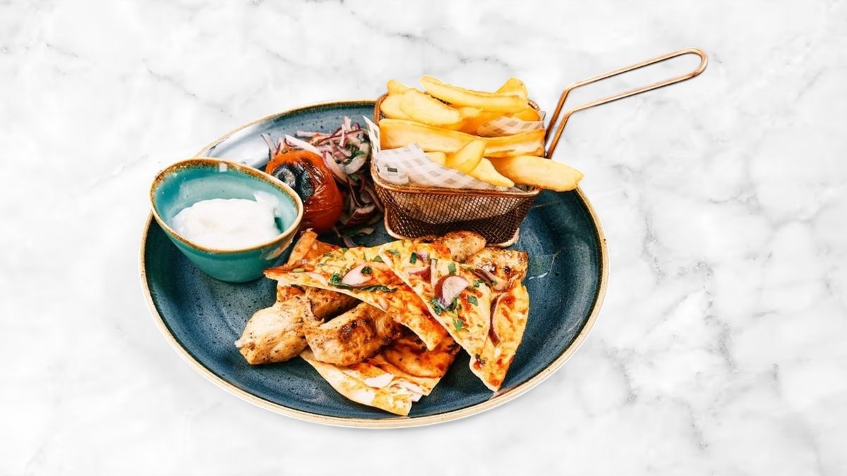 Baked chicken with yoghurt, tahini,pita, onion,sumak and pomegranate syrup Sült csirke,joghurt, tahini,pita,hagyma, szömörce és gránátalmaszirup