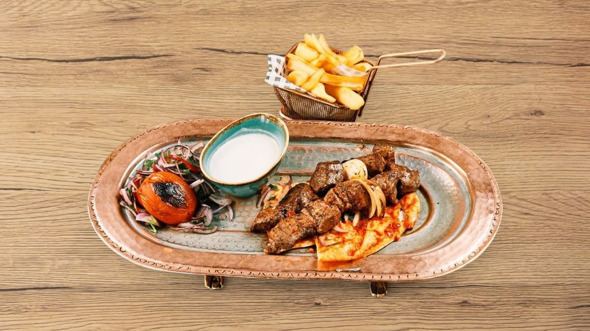 Char-grilled bonless lamb with spicy tahini sauce served with burgul. Faszénparázson grillezett csontozott bárányhús fűszeres tahini mártással, burgullal.