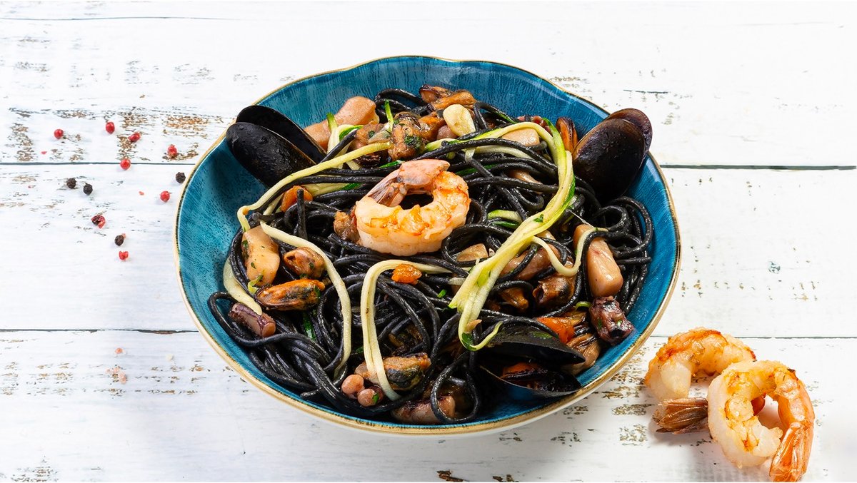 Sēpijas melnās tintes spageti ar jūras veltēm