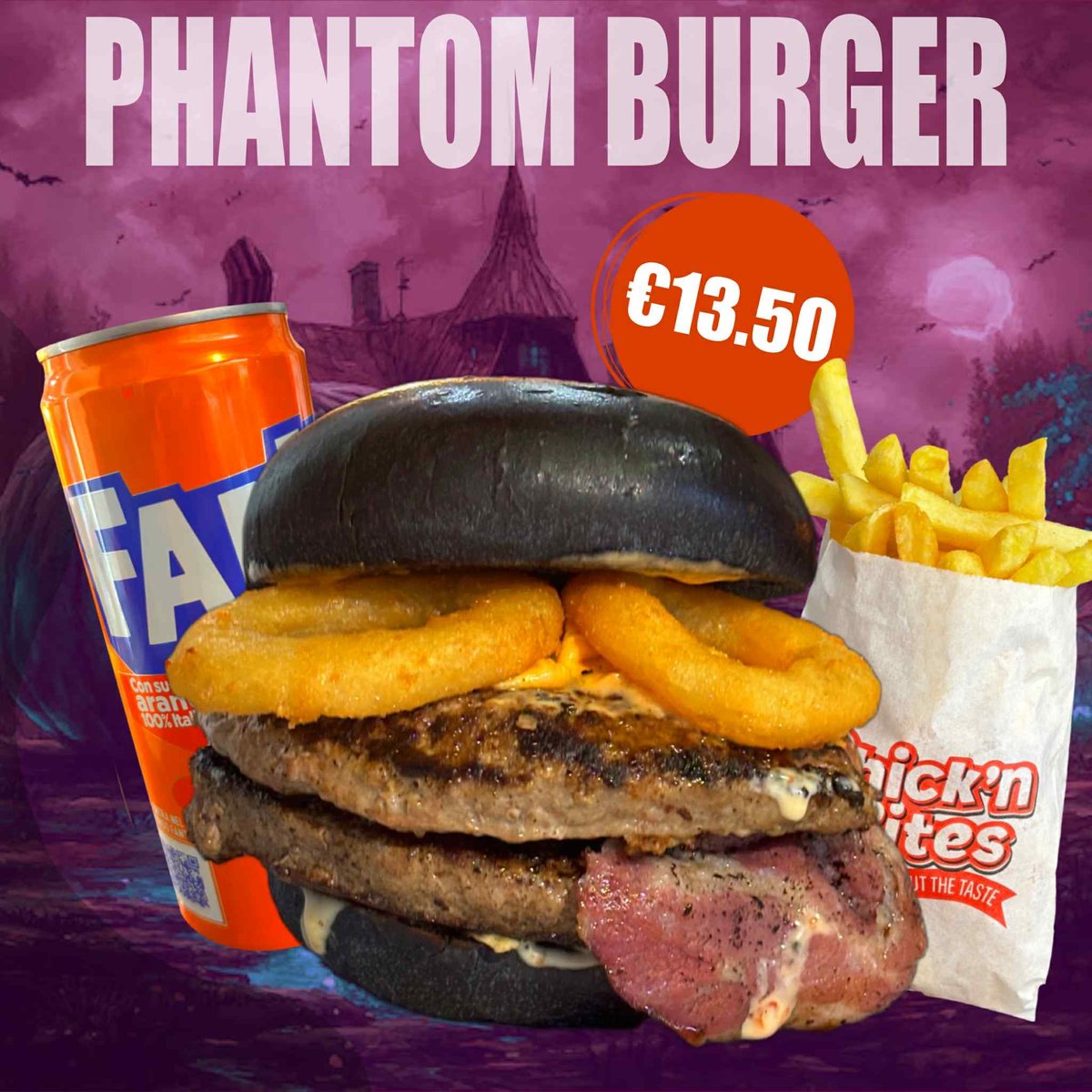 Phantom Burger Meal 2 beef patties, lettuce, onion, 2 onion rings, 2 slices cheese, bacon, spicy mayo, burger sauce. Served with fries and a soft drink.