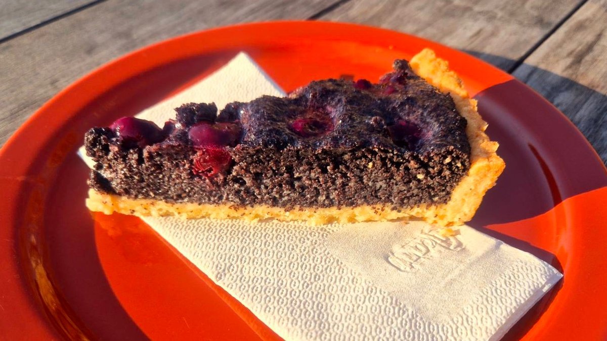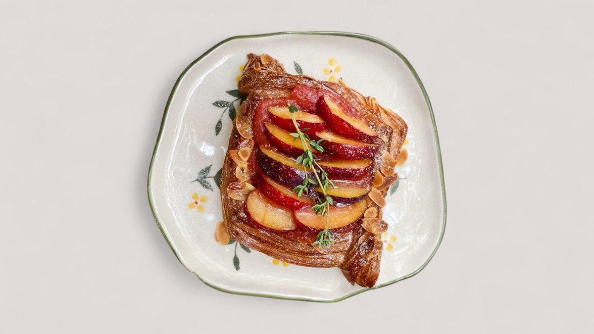 Hétvégi ajánlat! Helyben készített vajas leveles tészta, melyet mandulakrémmel, szilvakrémmel és friss szilvával töltöttünk meg. Kakukkfűvel díszítjük.
