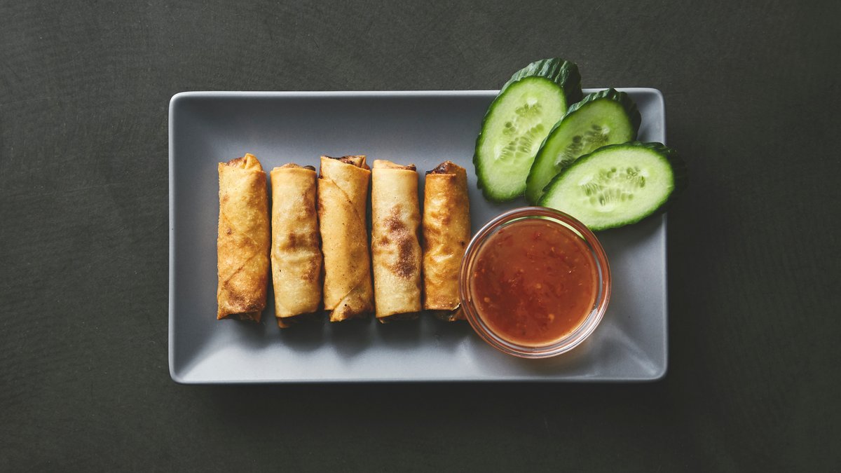 Hjemmelavet traditionelle thailandske forårsruller med fyld af hakkede gulerødder, hakket svinekød og rejer, tilsat orientalske krydderier. Serveres med chilisauce.