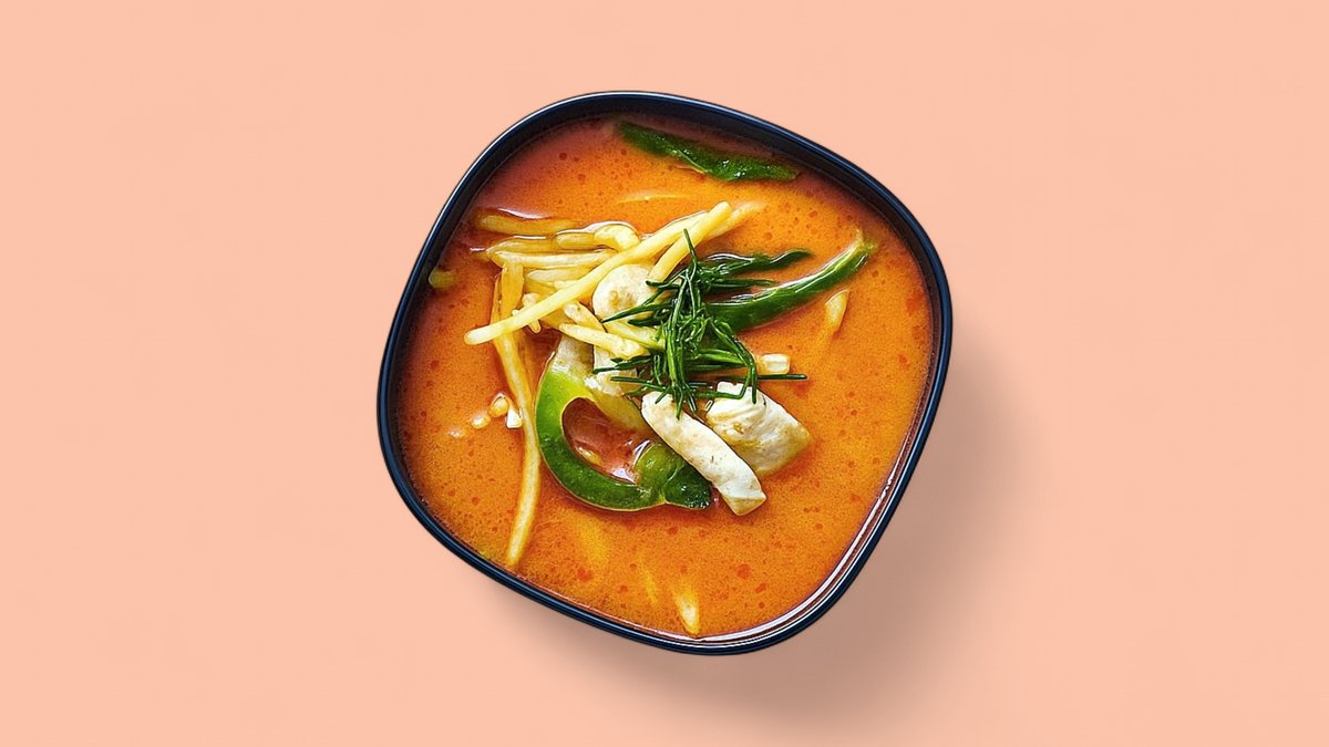 Thailandsk kyllingesuppe m. kokosmælk, tomater, forårsløg, champignon, limeblade og gulerødder. Serveres med ris.