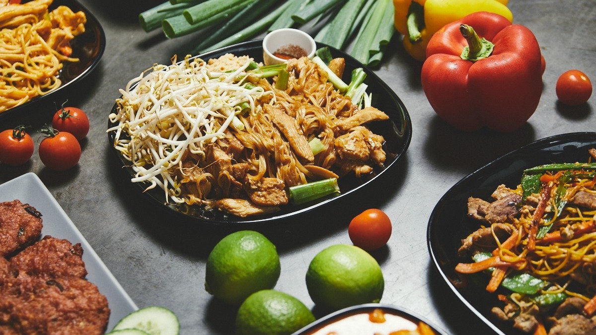 Ris med æg, basilikum, peberfrugt, frisk chili, hvidløg, løg og forårsløg. Vælg mellem kylling, oksekød, svinekød, vegetar tofu eller vegansk tofu. Ved valg af vegansk version, eller med spaghetti serveres retten uden æg.