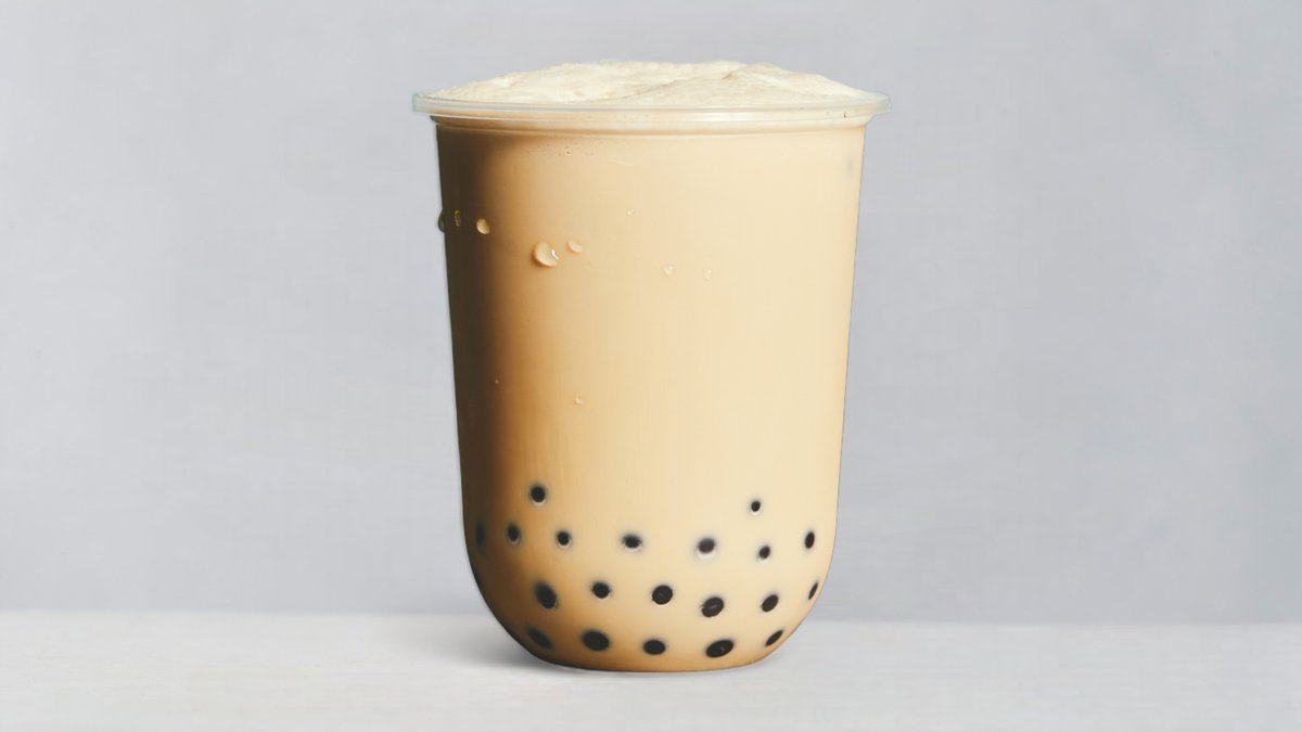 Kold og forfriskende bubble te med litchi smag og jordbær bobler.