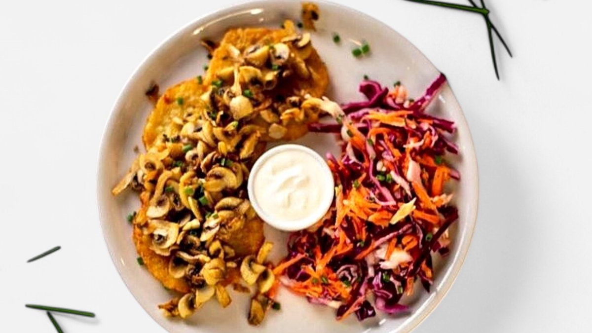 Kartupeļu pankūkas ar ceptiem šampinjoniem un vegānisko majonēzi 🥦