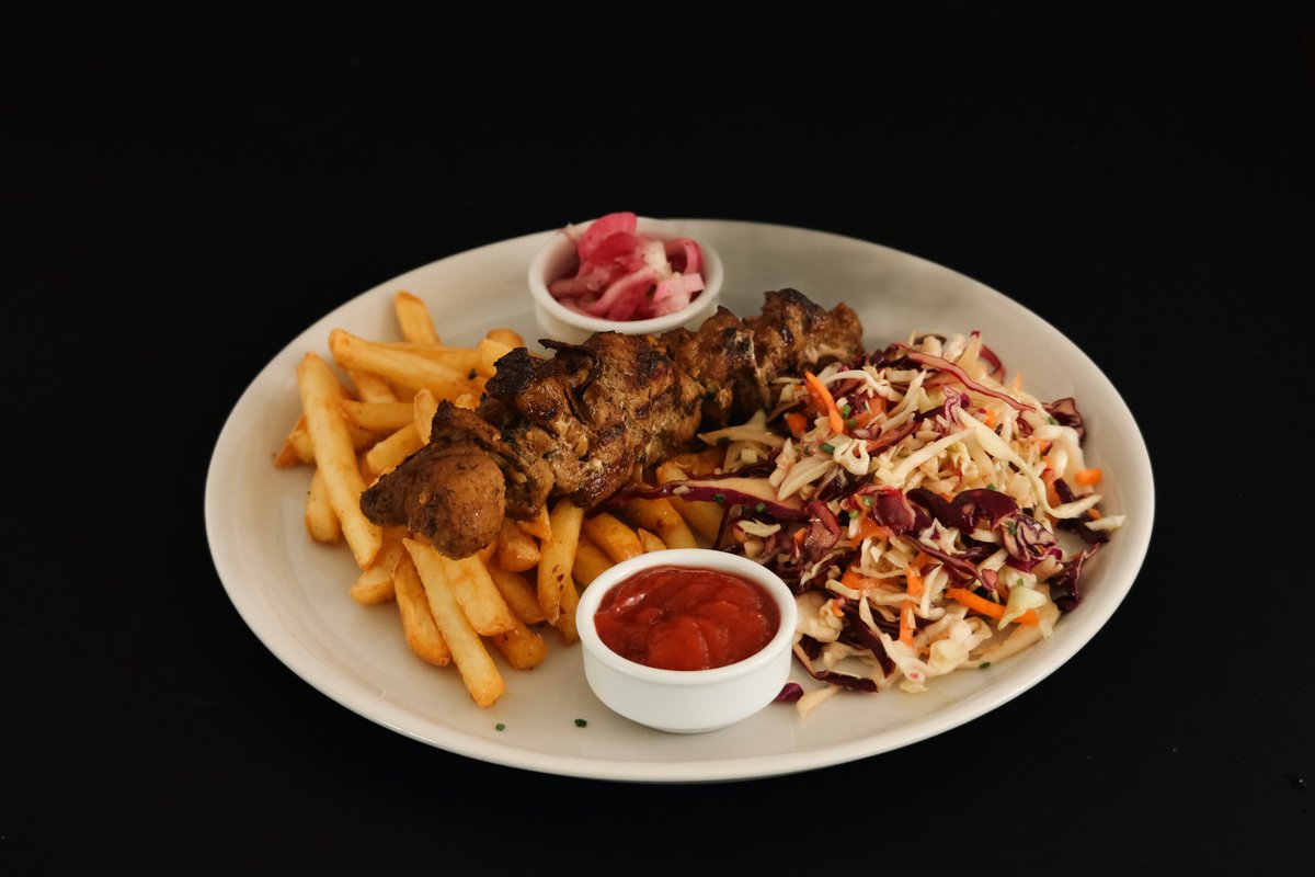 Vistas gaļas šašliks ar frī kartupeļiem, marinētiem sīpoliem un coleslaw salātiem