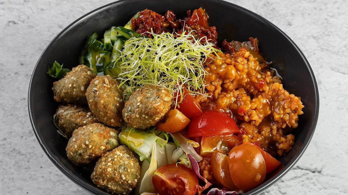 Bulgura salāti ar falafelu, saulē kaltētiem tomātiem un salātu mērci