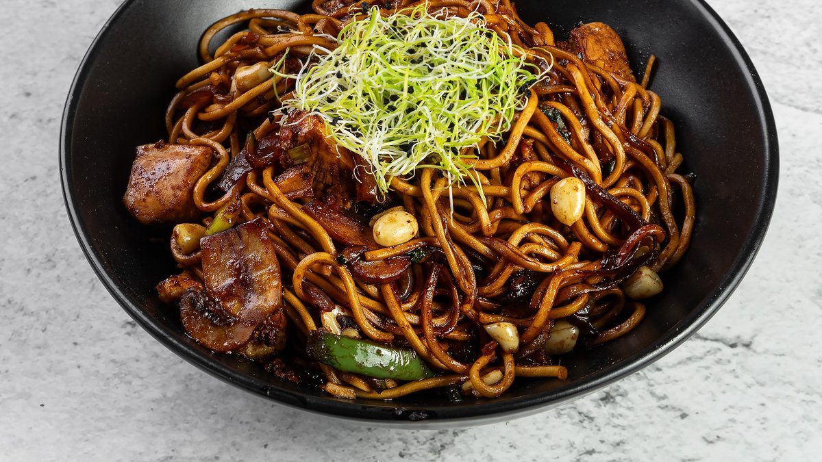 Olu nūdeļu voks ar vistu, papriku, šampinjoniem un zemesriekstiem