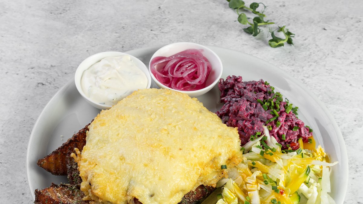Vistas gaļas karbonāde Ezīša gaumē ar vārītiem-ceptiem kartupeļiem, marinētiem sīpoliem, biešu un svaigajiem salātiem