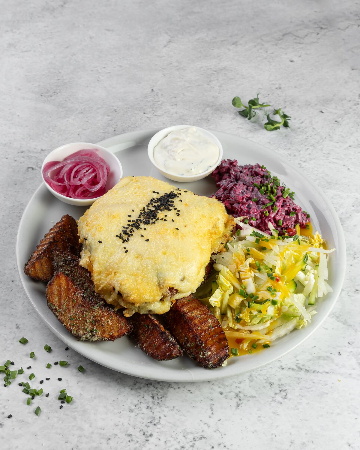 /LIELLOPA GAĻAS KOTLETE, ČEDARAS SIERS, TOMĀTS, MARINĒTS GURĶIS, KARAMELIZĒTI SĪPOLI, LEDUS SALĀTI, GURĶU MĒRCE/