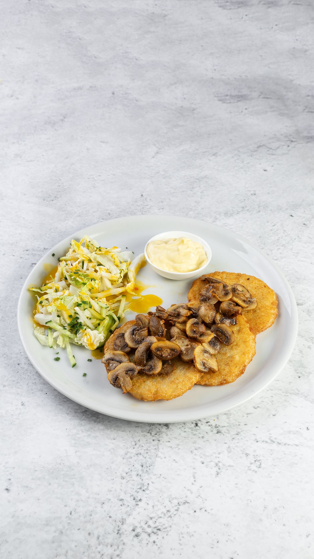 Kartupeļu pankūkas ar ceptiem šampinjoniem un vegānisko majonēzi 🥦