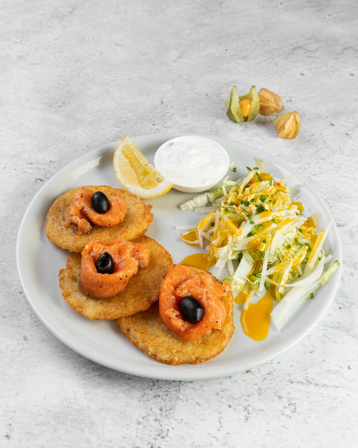 Kartupeļu pankūkas ar mazsālītu lasi un krējumu