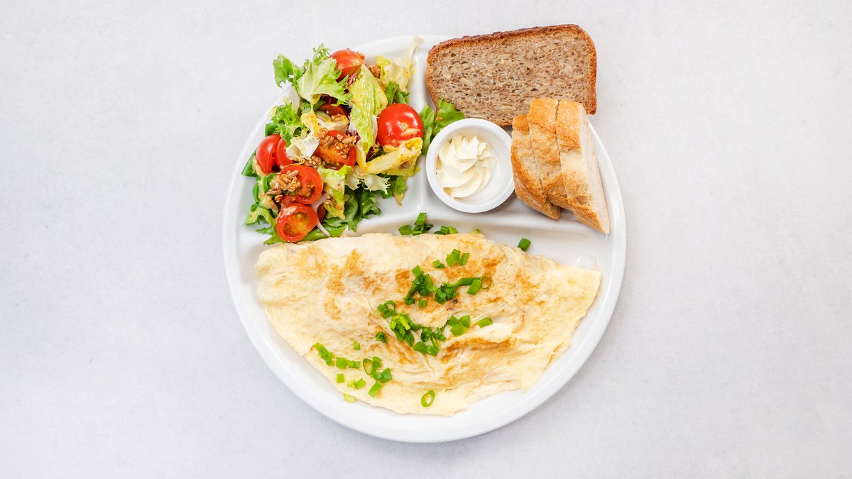 Omlet z 3 jaj z podgrzybkami, serem wędzonym, płatkami chilli, pieczywem, masłem i sałatką