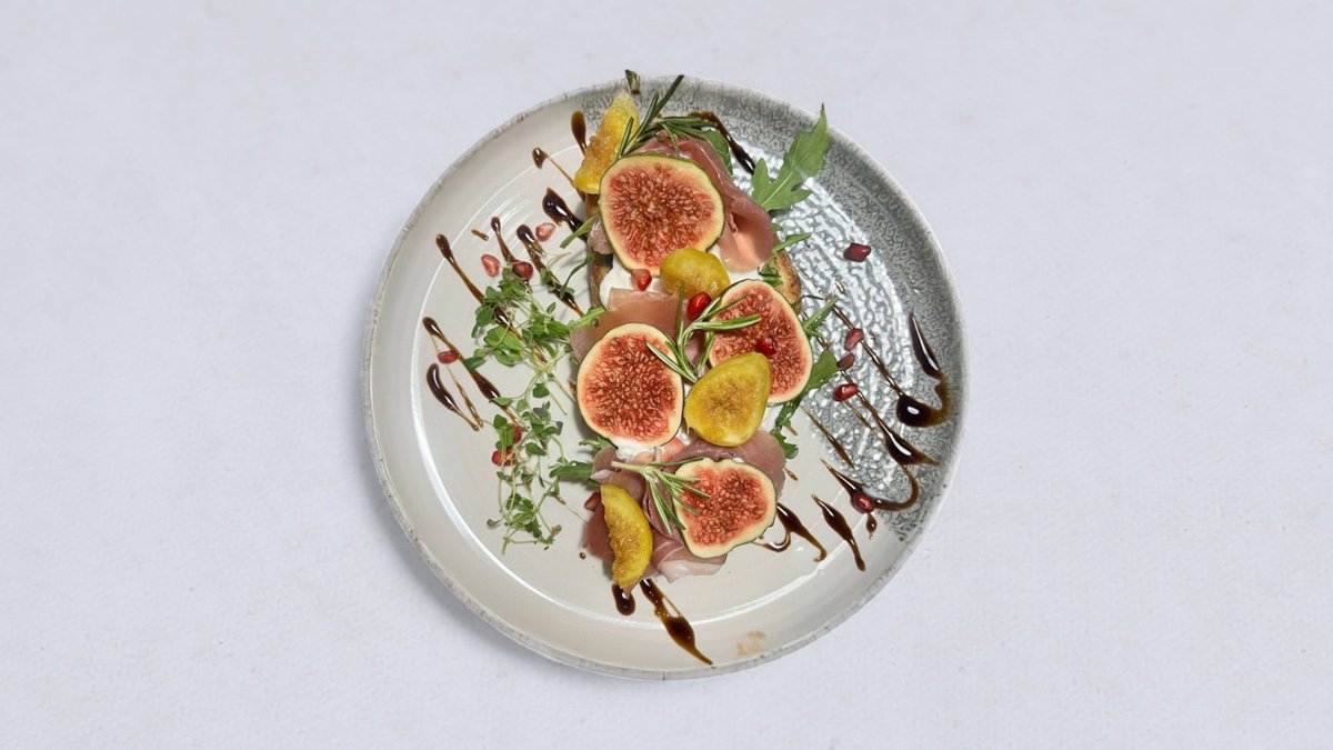 Grzanka z wiejskiego chleba z figami, prosciutto, burratą, brzoskwiniami, obsypana crunchem i rukolą, dodatkowo polana balsamico