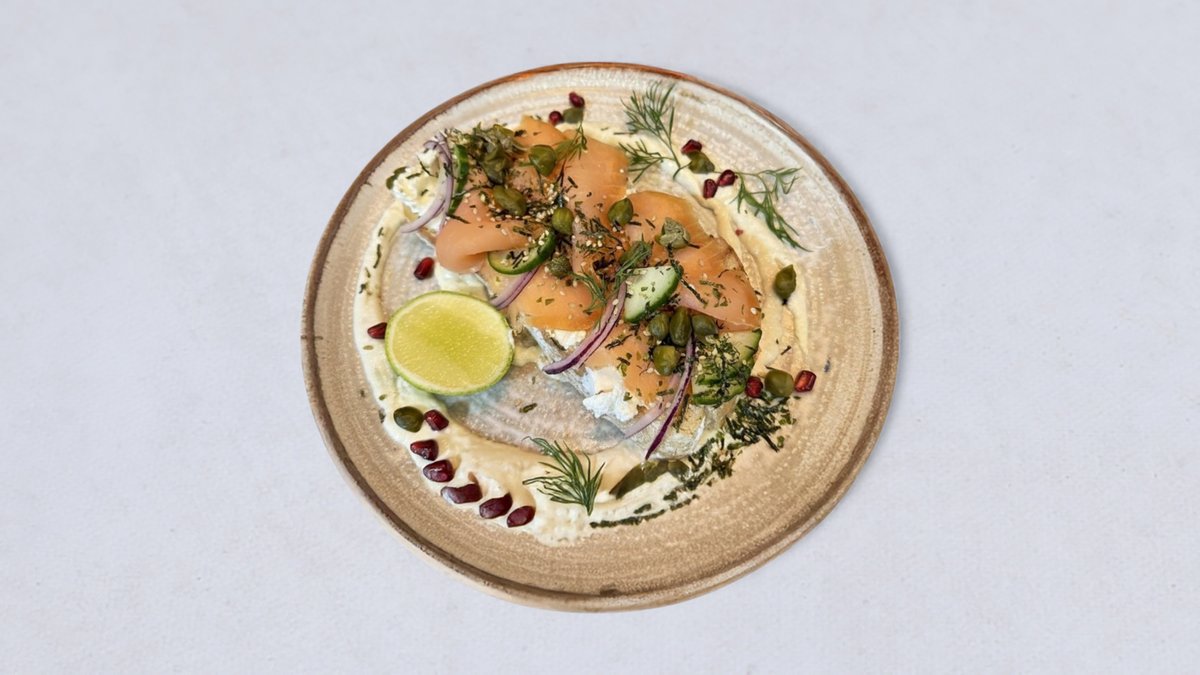Grzanka na wiejskim chlebie z łososiem wędzonym, furikake, kapary, kremowy serek, sos chrzanowy, cebula czerwona, ogórek świeży