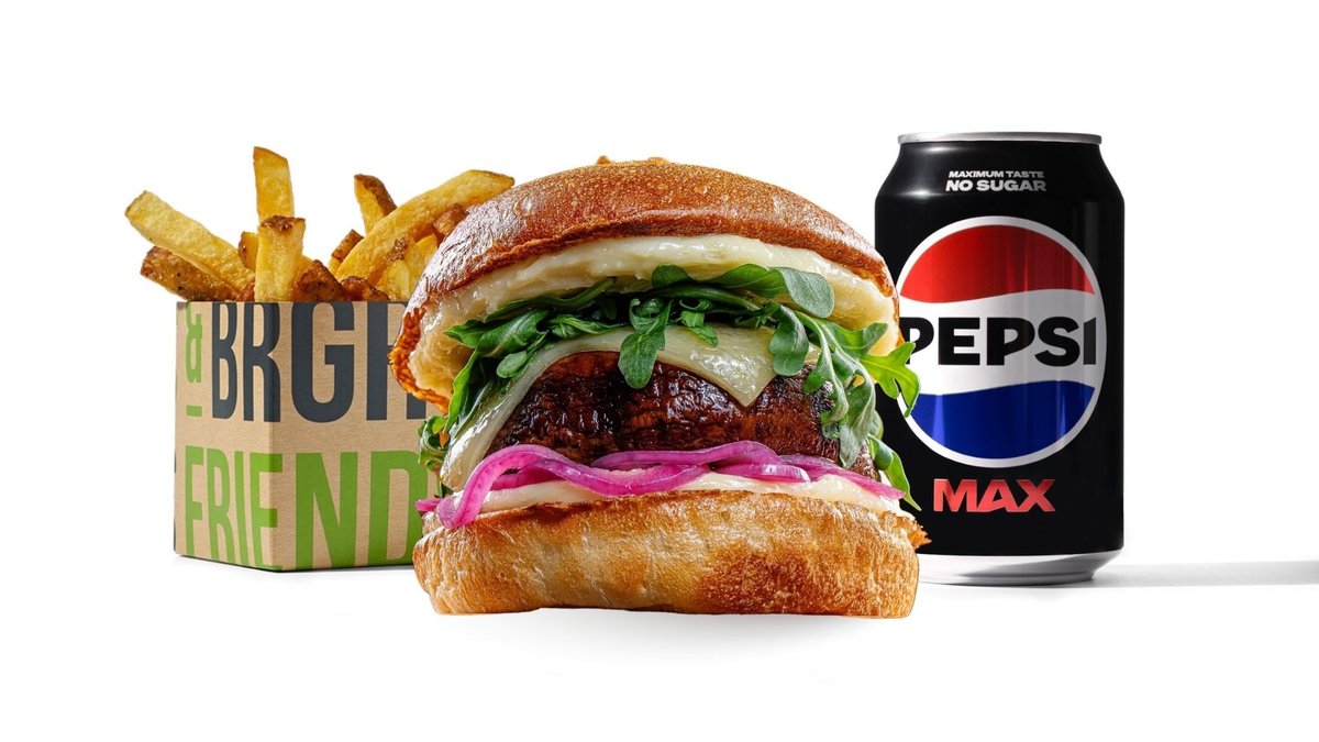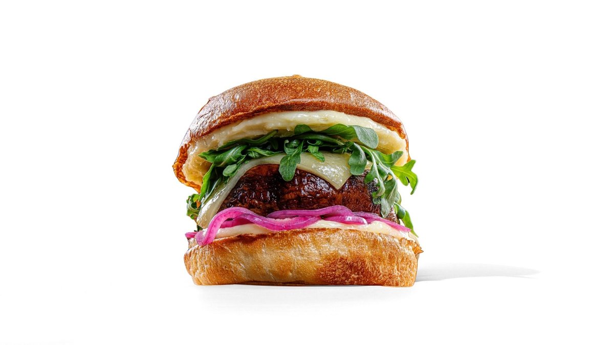 Portobello-sieni, cheddar, rucola, pikkelöity punasipuli ja parmesaanimajoneesi. Annokseen kuuluu ranskalaiset ja valitsemasi juoma.