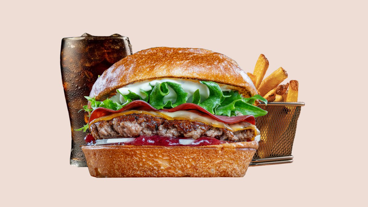 110 g pihvi, savujuusto, poron kylmäsavupaisti, salaatti, sipuli, karpalohillo ja Ranch-kastike. Lisäksi ranskalaiset ja valitsemasi juoma.