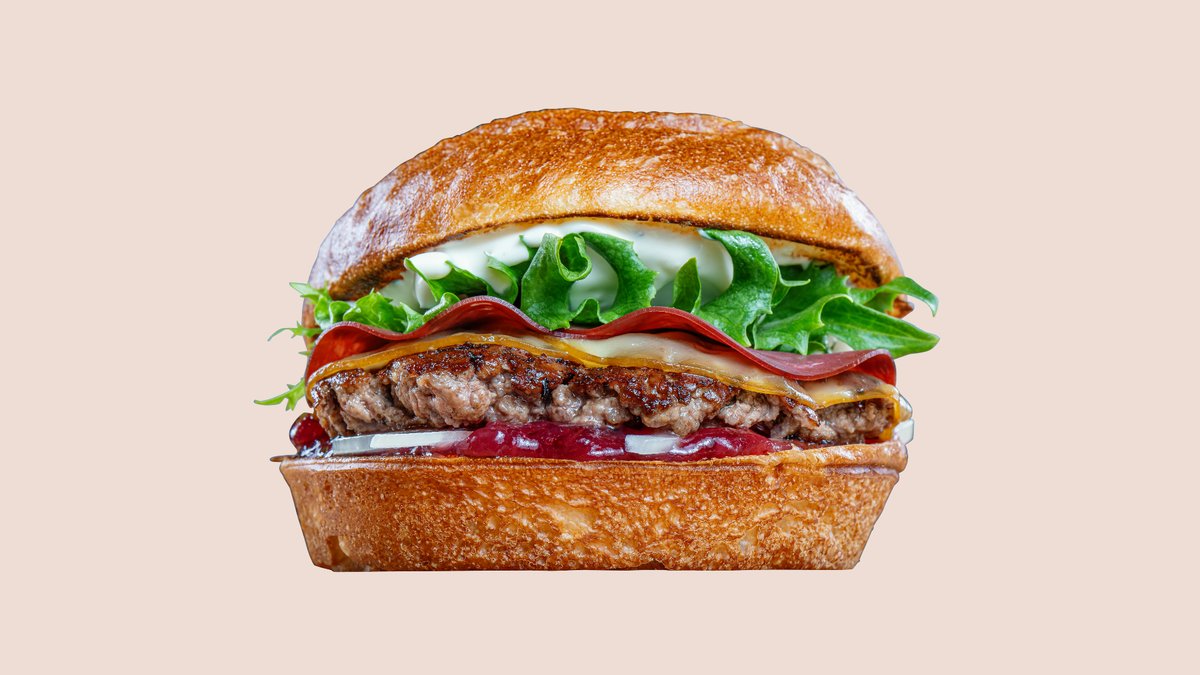 1 x 110g naudanlihapihvi, cheddar sulatejuusto, sipuli, tomaatti, salaatti, Friends-majoneesi.