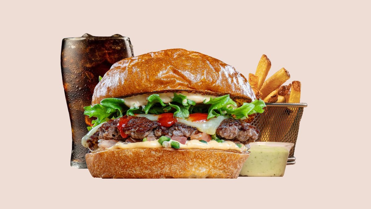 2 x 110g naudanlihapihvi, cheddar, Pico de Gallo, salaatti, Chipotle-majoneesi, sriracha. Lisäksi ranskalaiset ja valitsemasi juoma.