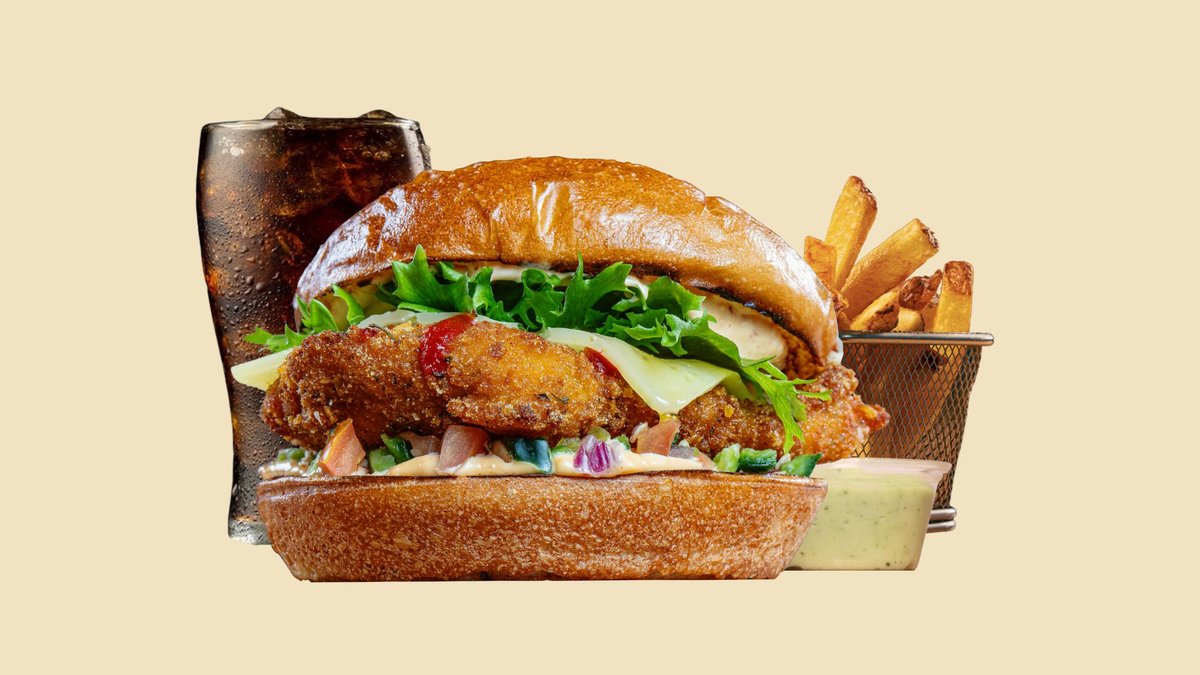 Paneroitu kanapihvi, cheddar, salaatti, Pico de Gallo, Sriracha, Chipotle-majoneesi. Lisäksi Ranskalaiset, Dippi ja valitsemasi Juoma.