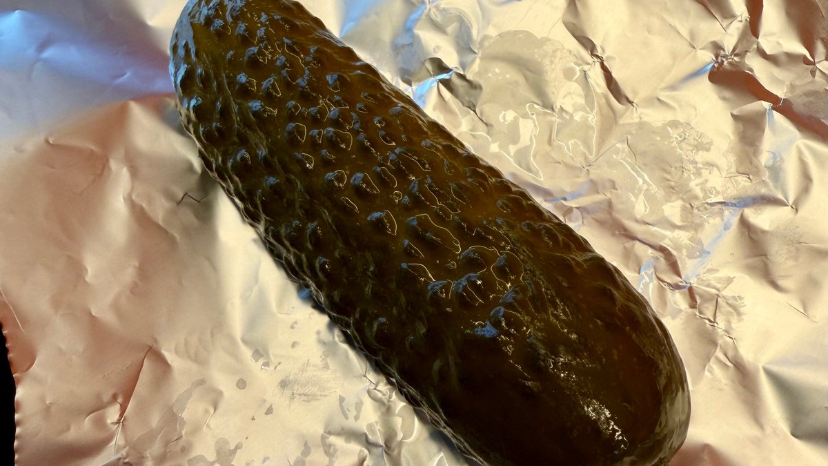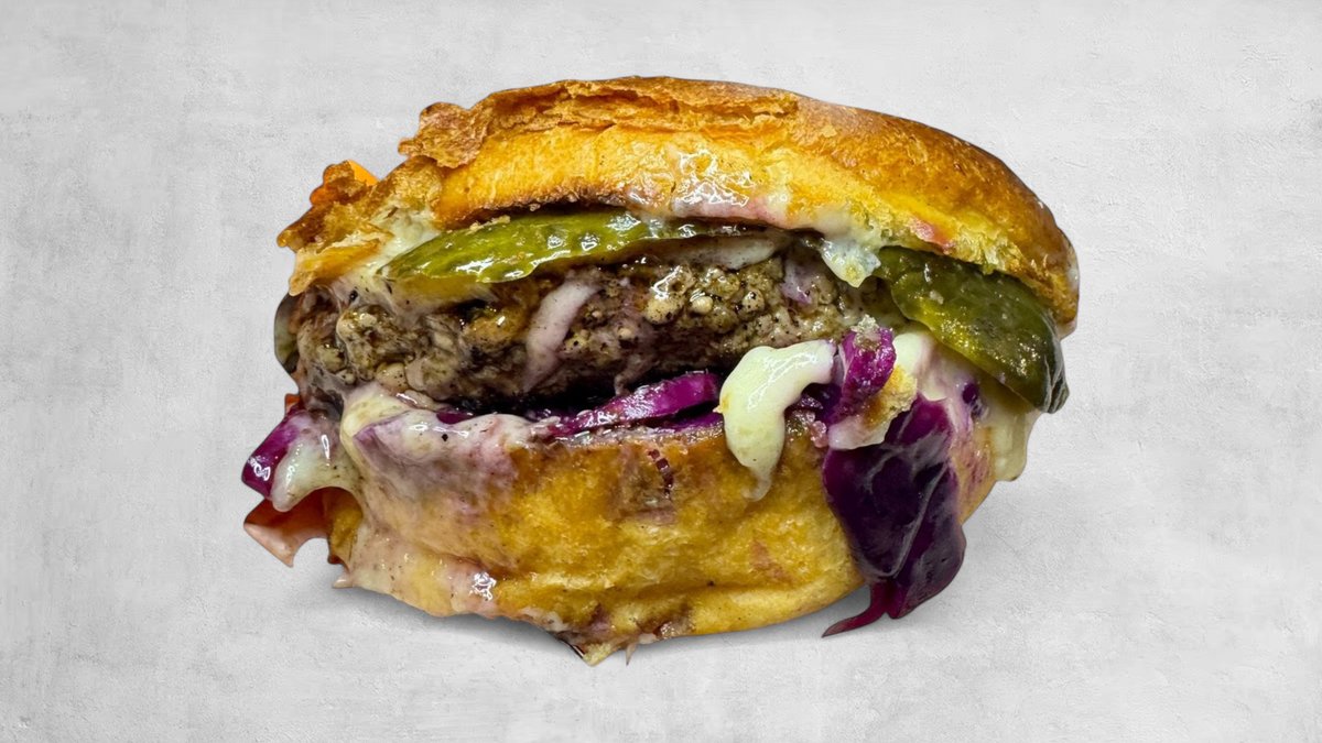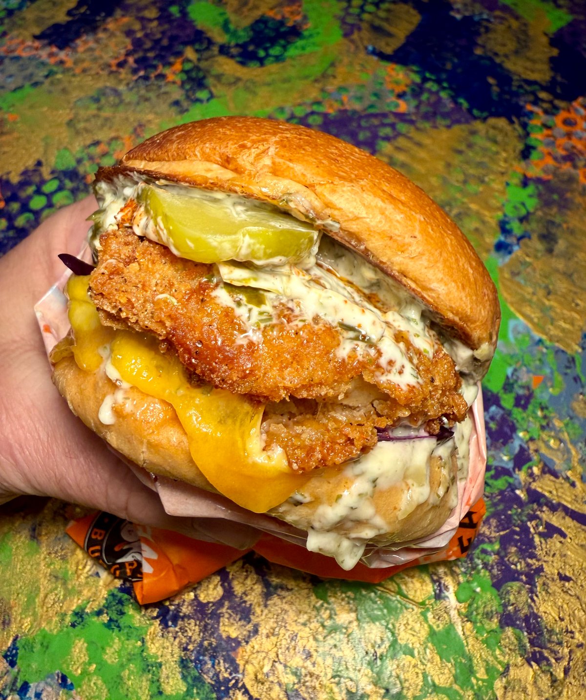 Krydret marineret kyllingebryst med kremet sauce, ost, kosher pickles, signature sauce og en bund af knasende frisk rødkål.