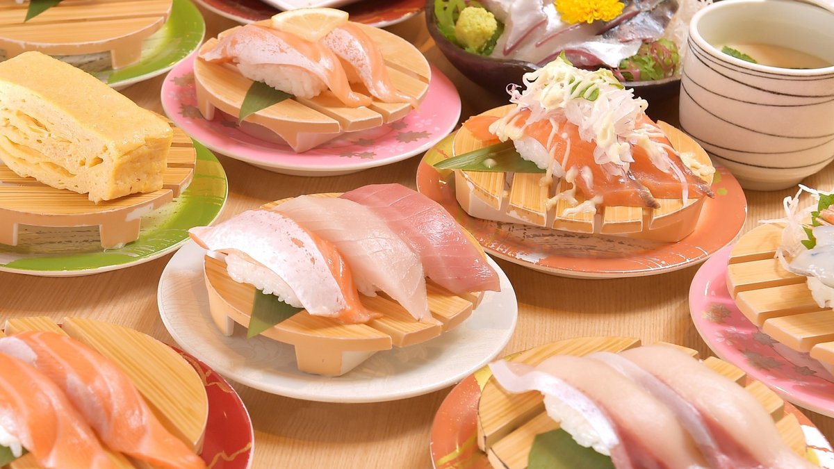 人気の並ネタ勢揃い (まぐろ、サーモン、びんちょうまぐろ、生げそ、玉子焼、えび、赤いか、ねぎまぐろ軍艦、えんがわ、たこ)