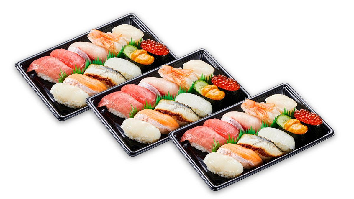 🔸1人前3個でお届け 【商品内容】 中とろ3、まぐろ3、サーモン3、活〆寒ぶり3、えんがわ3、ほたて3、えび3、いか3、煮穴子3、いくら3、特盛ねぎとろ3 ※国産米を使用しております。 【注意事項】 「わさび抜き」でご提供しています。別添のわさびをつけてお召し上がりください。