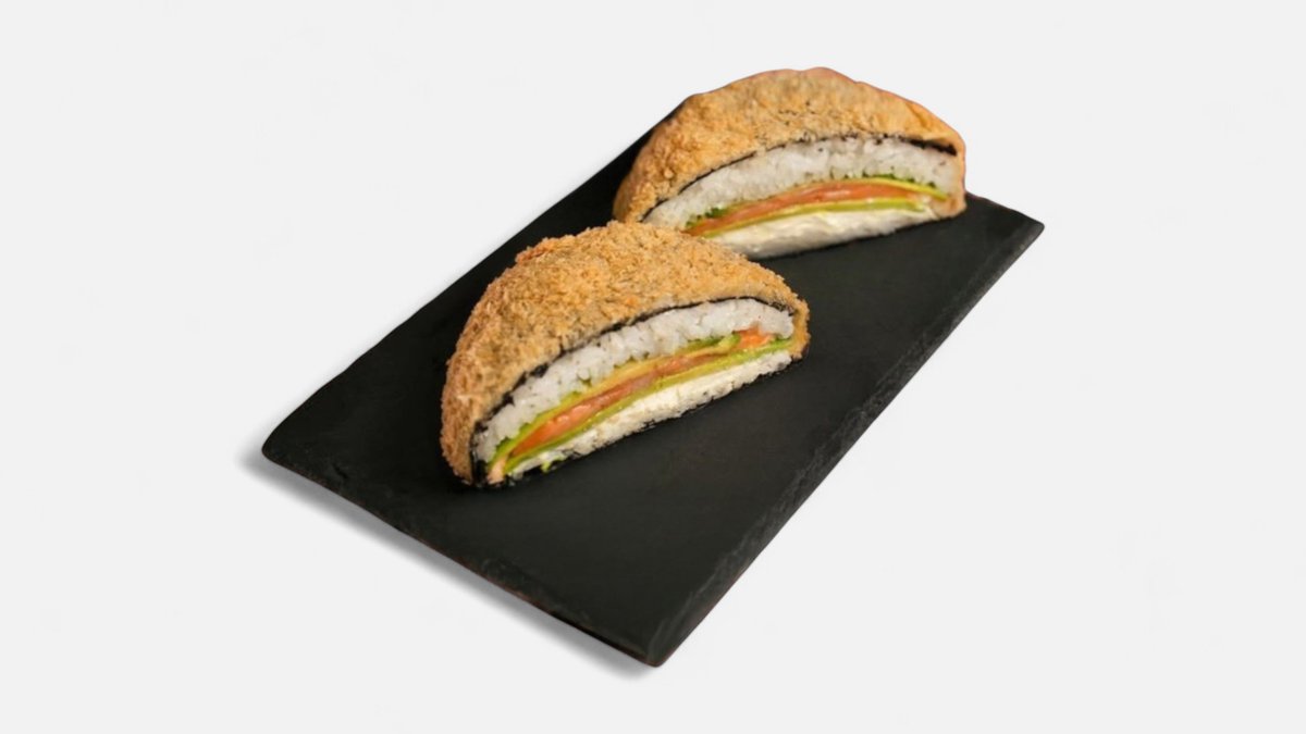 Rīsu burgeris ar avokado un krēmsieru, piepildīts ar Tavas izvēles sastāvdaļām — svaigu lasi vai sulīgām garnelēm.