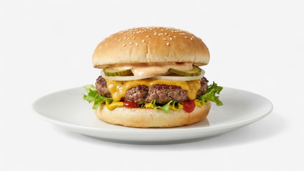 125g täyslihapihvi, sinappi, ketsuppi, sipuli, cheddarjuustoa kurkkusalaatti, salaatti, amerikankastike