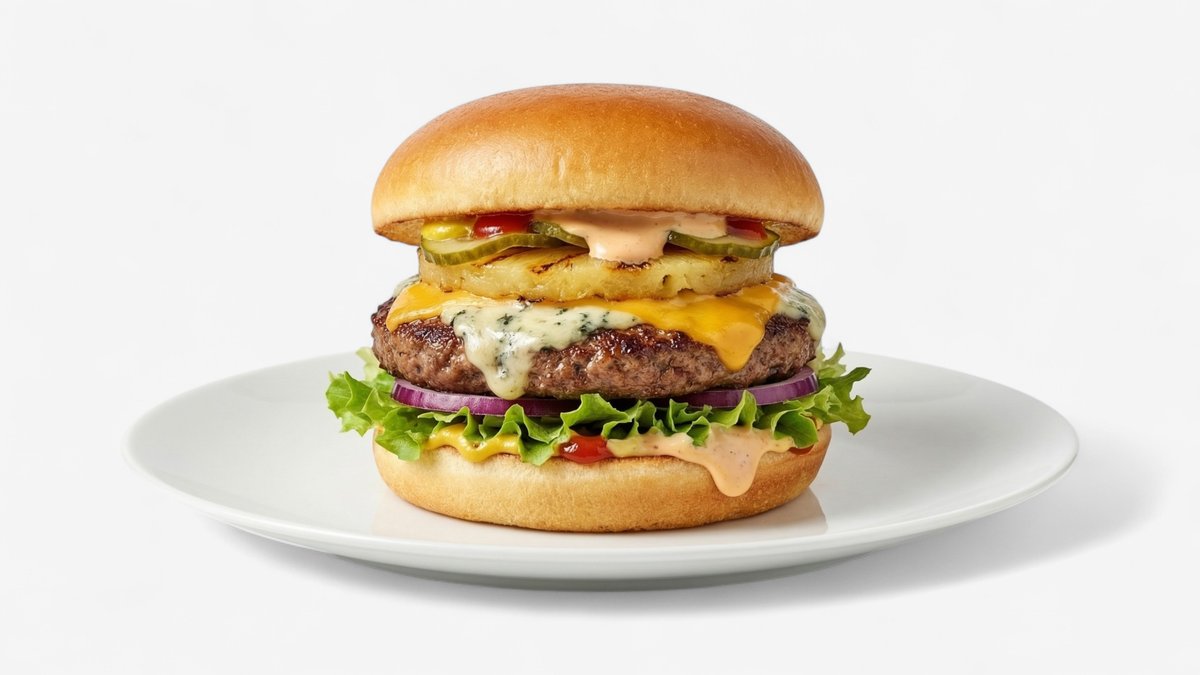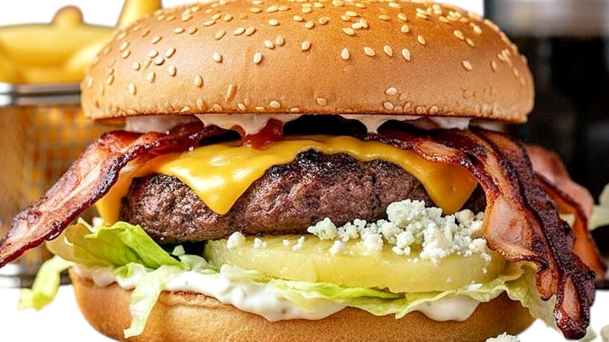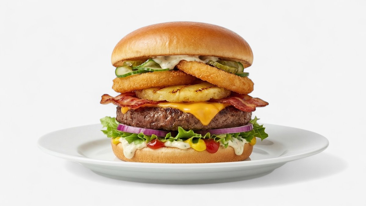 180g täyslihapihvi, pekoni, ananas, paneroidut sipulirenkaat, sinappi, ketsuppi, sipuli, cheddarjuustoa kurkkusalaatti, salaatti, remouladekastike