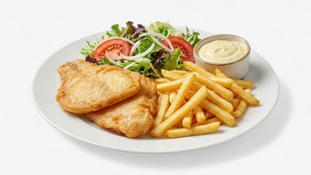 Tikkuperunat, 2x kampelafile, salaatti, tomaati, sipuli, remouladekastike