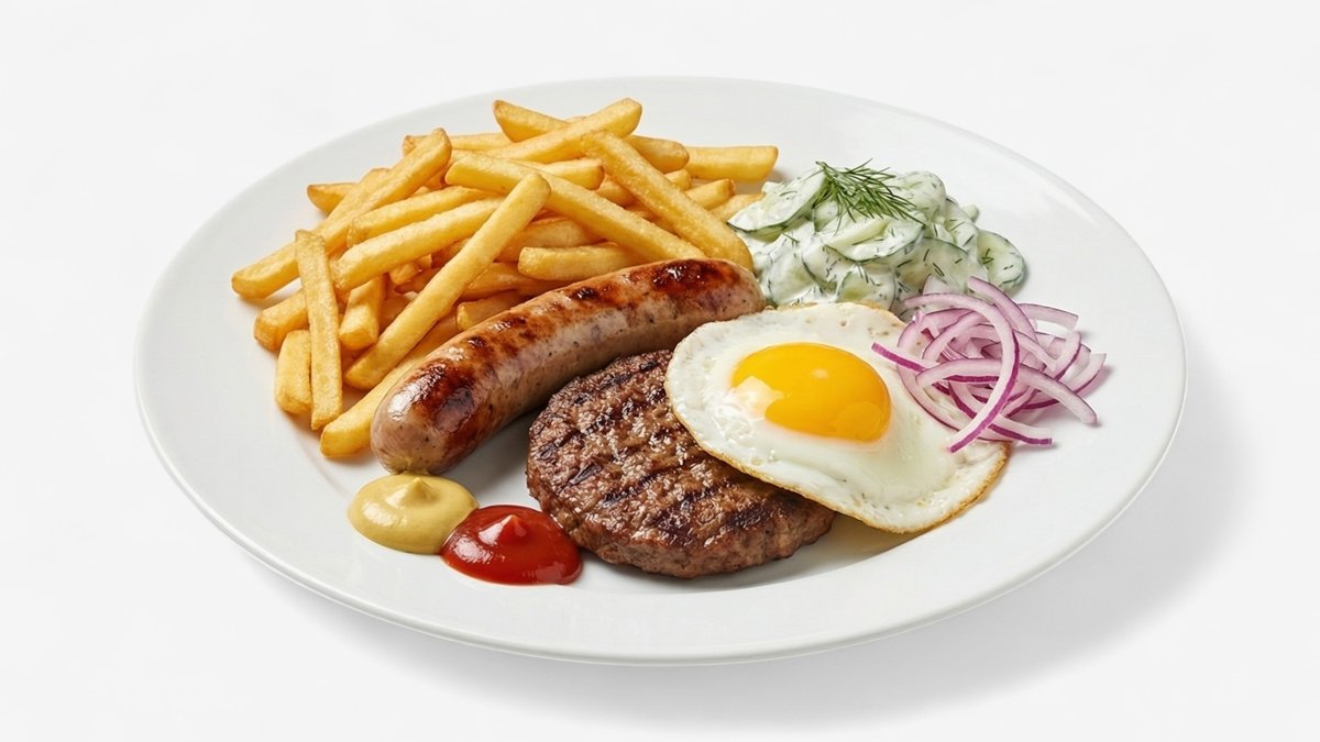 Ranskalaiset, berliinimakkara,100g täyslihapihvi, kananmuna, sinappi, ketsuppi, sipuli, kurkkusalaatti
