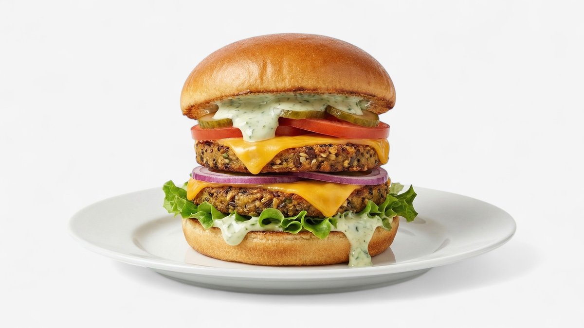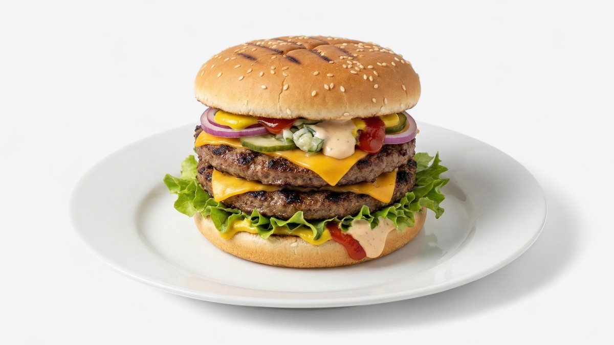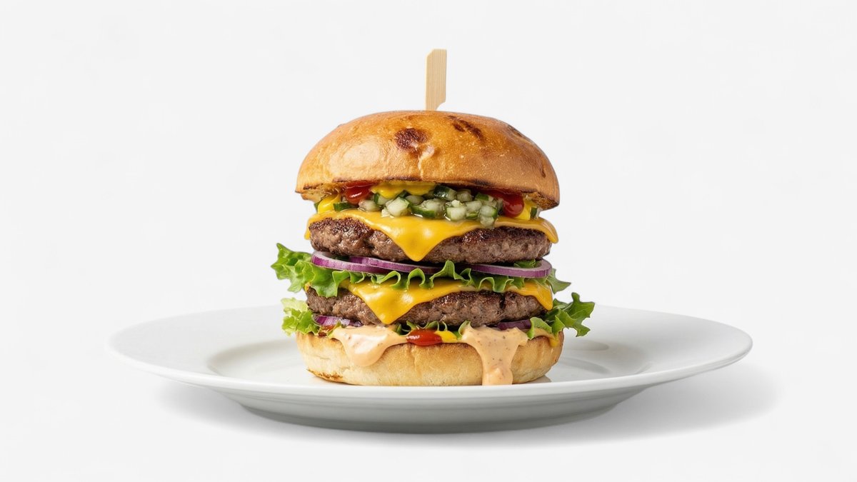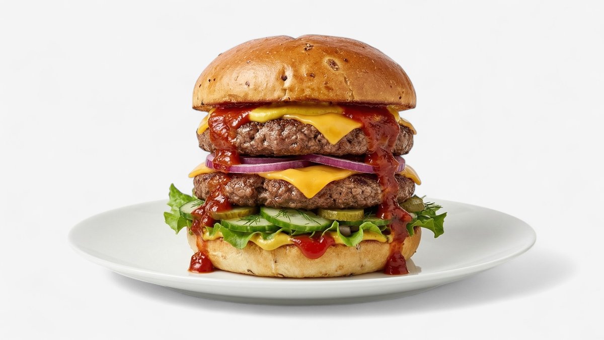 2x100g täyslihapihvi, sinappi, ketsuppi, cheddarjuustoa kurkkusalaatti, sipuli, salaatti, amerikankastike