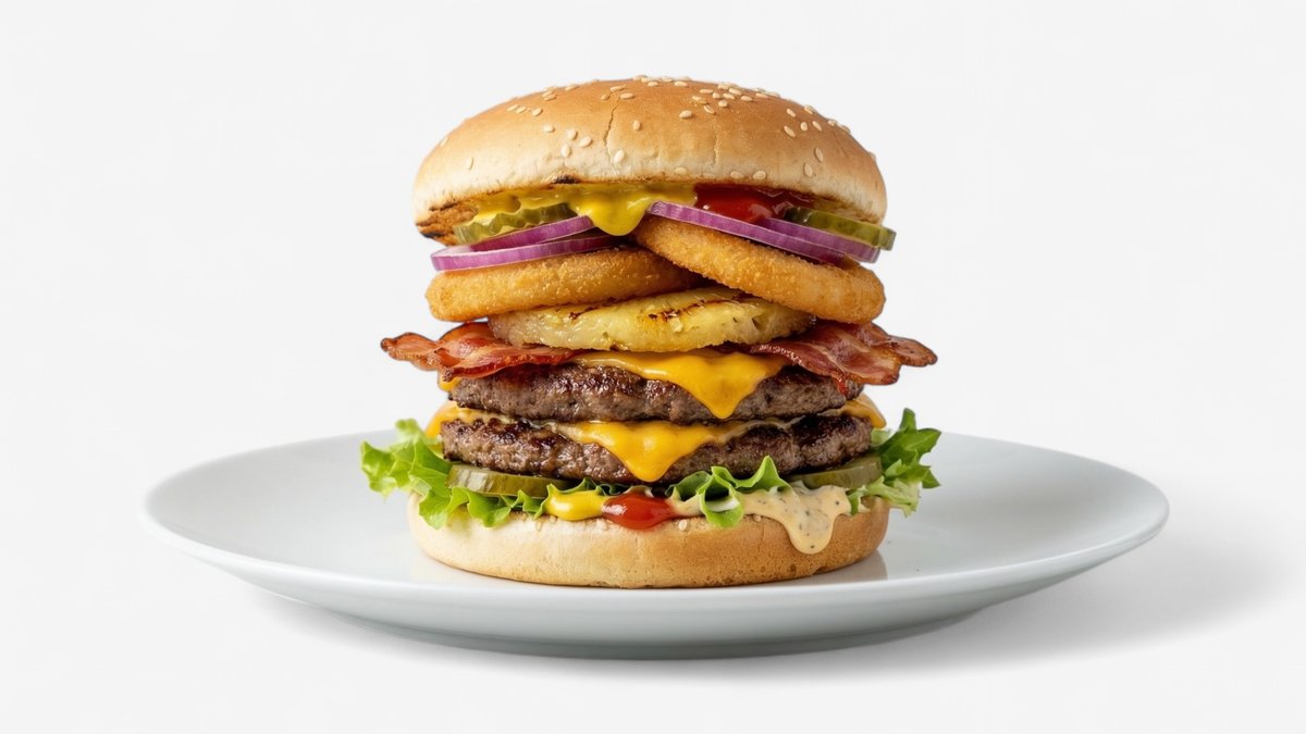 2x180g täyslihapihvi, pekoni, ananas, paneroidut sipulirenkaat, sinappi, ketsuppi, sipuli, cheddarjuustoa kurkkusalaatti, salaatti, remouladekastike