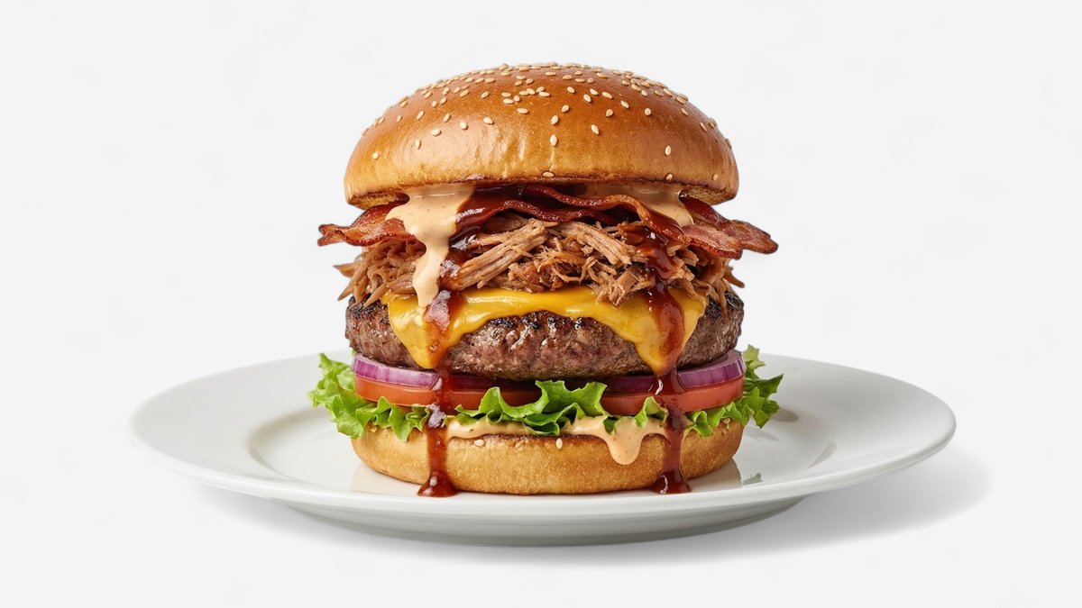 Pulledpork, pekoni, salaatti, punasipuli, tomaatti, kingkastike, BBQ-kastike cheddarjuustoa