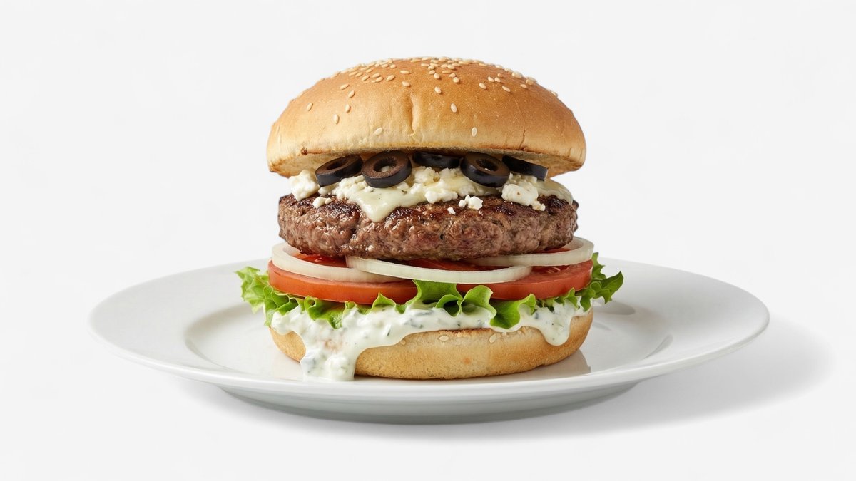 2x180g täyslihapihvi, feta, oliivi, sipuli, tomaatti, salaatti, tzatziki