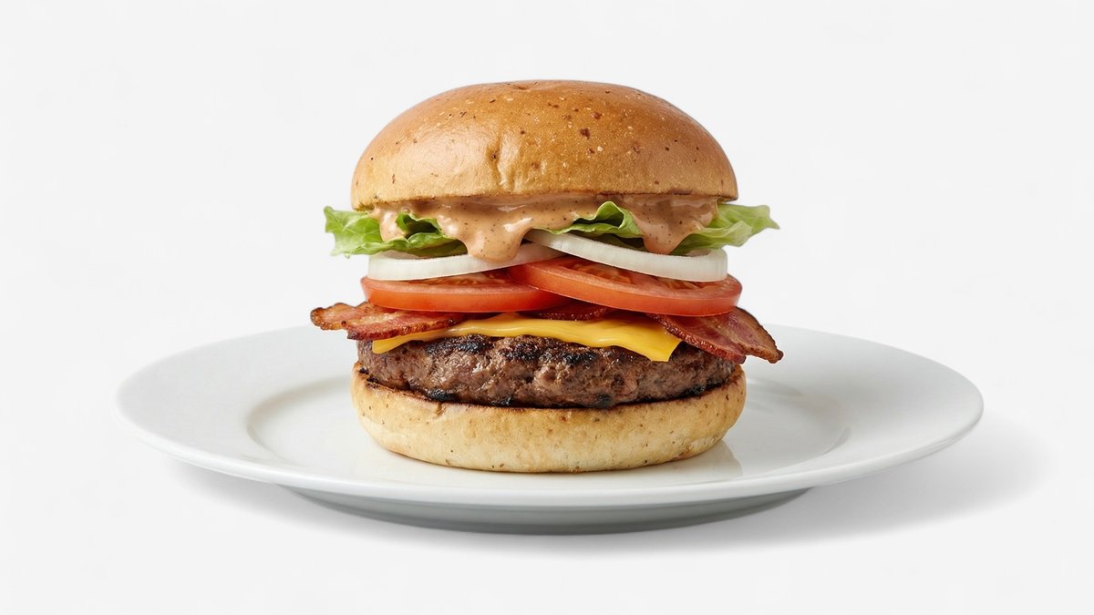 130g jauhelihapihvi, pekoni, juusto, tomaatti, sipuli, salaatti, savuchilimajoneesi