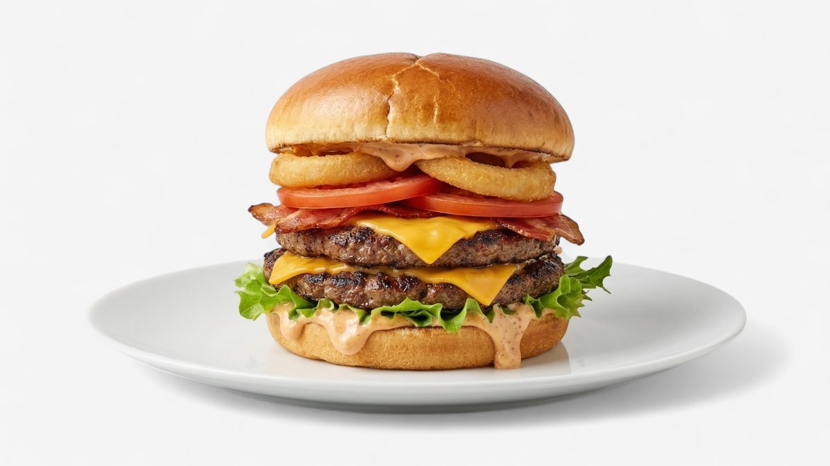 2x130g jauhelihapihvi, pekoni, juusto, tomaatti, sipuli, salaatti, savuchilimajoneesi