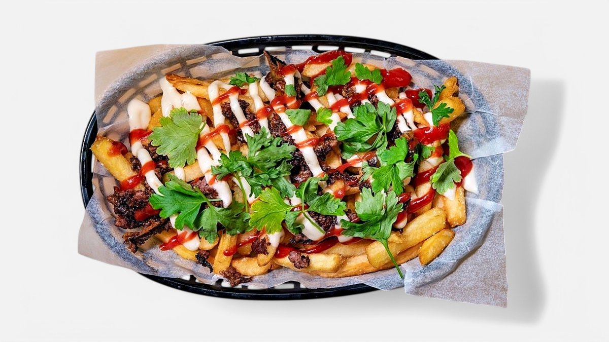 Isot ranskalaset, smäshätty naudan jauheliha, cheddar, caesarkastike, ketsuppi, lehtipersilja